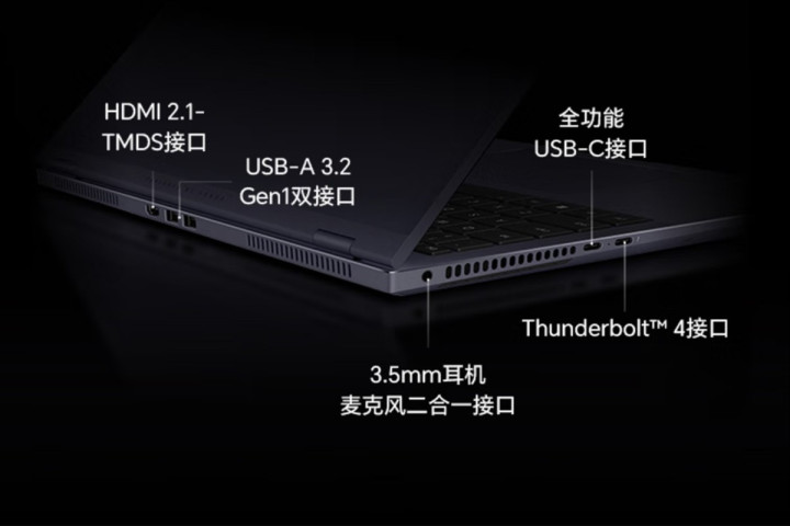 扩展接口部分,笔记本采用了2A2C的方案,还有HDMI接口。其中还包含了一个雷电4高速接口,无论是速度还是规格都能满足要求,HDMI2.1接口支持4K120Hz或者8K60Hz输出。
